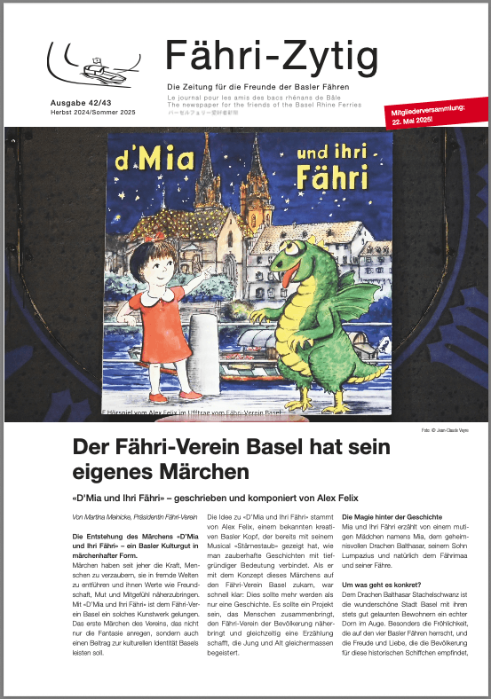 Die Fähri-Zytig erscheint 2x jährlich im Frühling und im Herbst. Sie wird den Mitgliedern gratis zugestellt und die aktuelle Ausgabe #44 (2/2025) liegt auf den vier Fähren, bei Basel Tourismus sowie im Restaurant Papiermühle Basel auf (Auflage: 7’000 Expl.). Frühere Ausgaben sind nachfolgend online abrufbar.